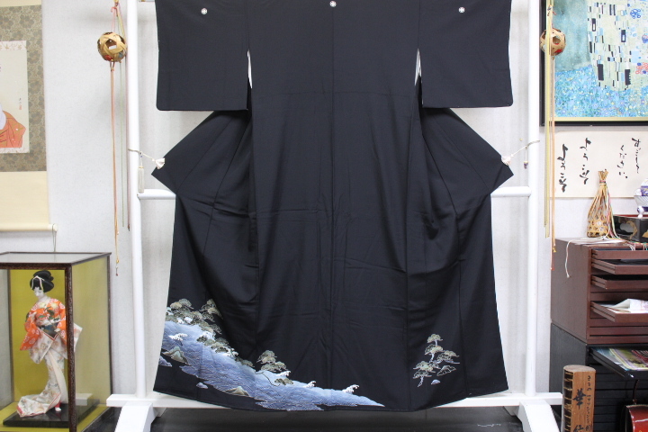 - きもの今昔8679 正絹黒留袖紋付 比翼付き 比翼は正絹羽二重付き 手描きのさざ波に目出度い三階松の柄 身丈155cm