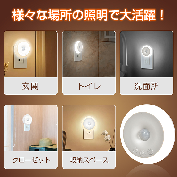 - 人感センサーライト 室内 玄関 廊下 コンセント LED 給電式 トイレ 明暗