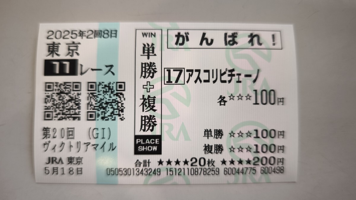 - ヴィクトリアマイル2025 アスコリピチェーノ現地的中単勝・複勝(がんばれ)馬券 匿名配送