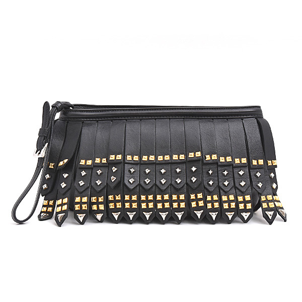 > プラダ バッグ レディース スタッズ フリンジ リスト クラッチ バッグ ポーチ レザー ブラック PRADA 1N1735 中古