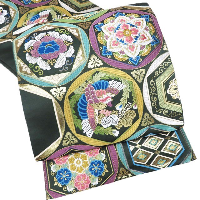 > 袋帯 中古 リサイクル 正絹 カジュアル 六通 西陣織 証紙付き とみや織物 円窓飾華文 箔糸 織部色 多色 金 きもの北條 A1207-12