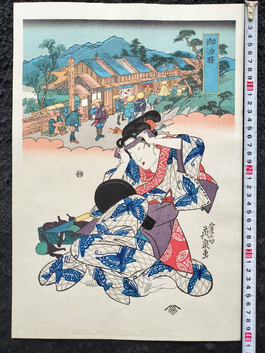 - 【真作】大正期 浮世絵木版画 渓斎英泉「美人東海道 御油驛」美人図 名所絵 大判 錦絵 保存良い