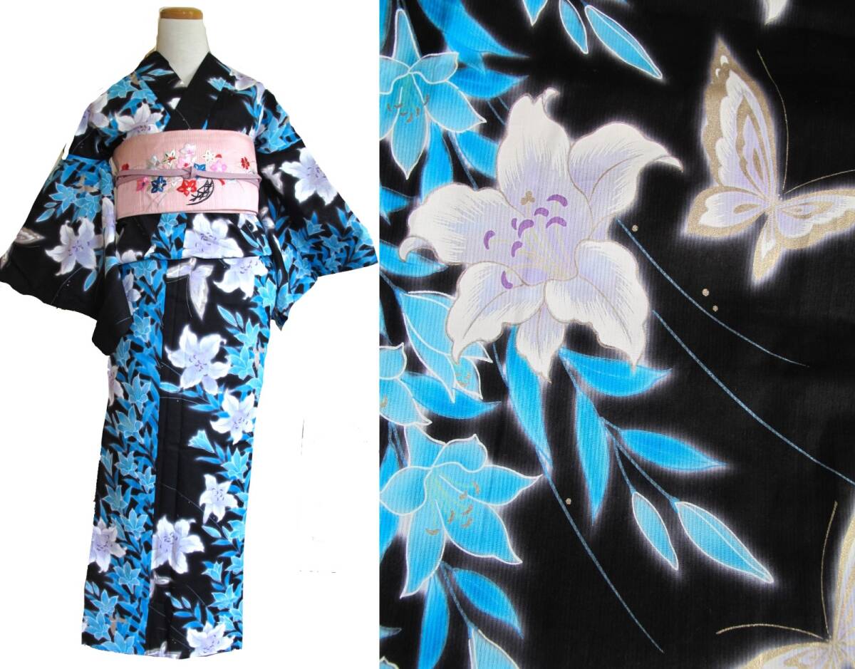 - 幻想 Kansai 百合に蝶々 黒地 浴衣