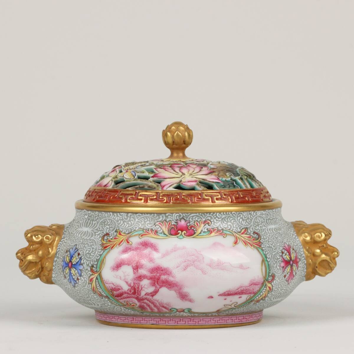 > 多宝閣 ■ 202229 中国磁器 中国骨董【清朝乾隆時代のエナメル金箔窓風景人物物語文様動物耳中空香炉】 施釉陶 陶芸 置物 收藏品 孤品