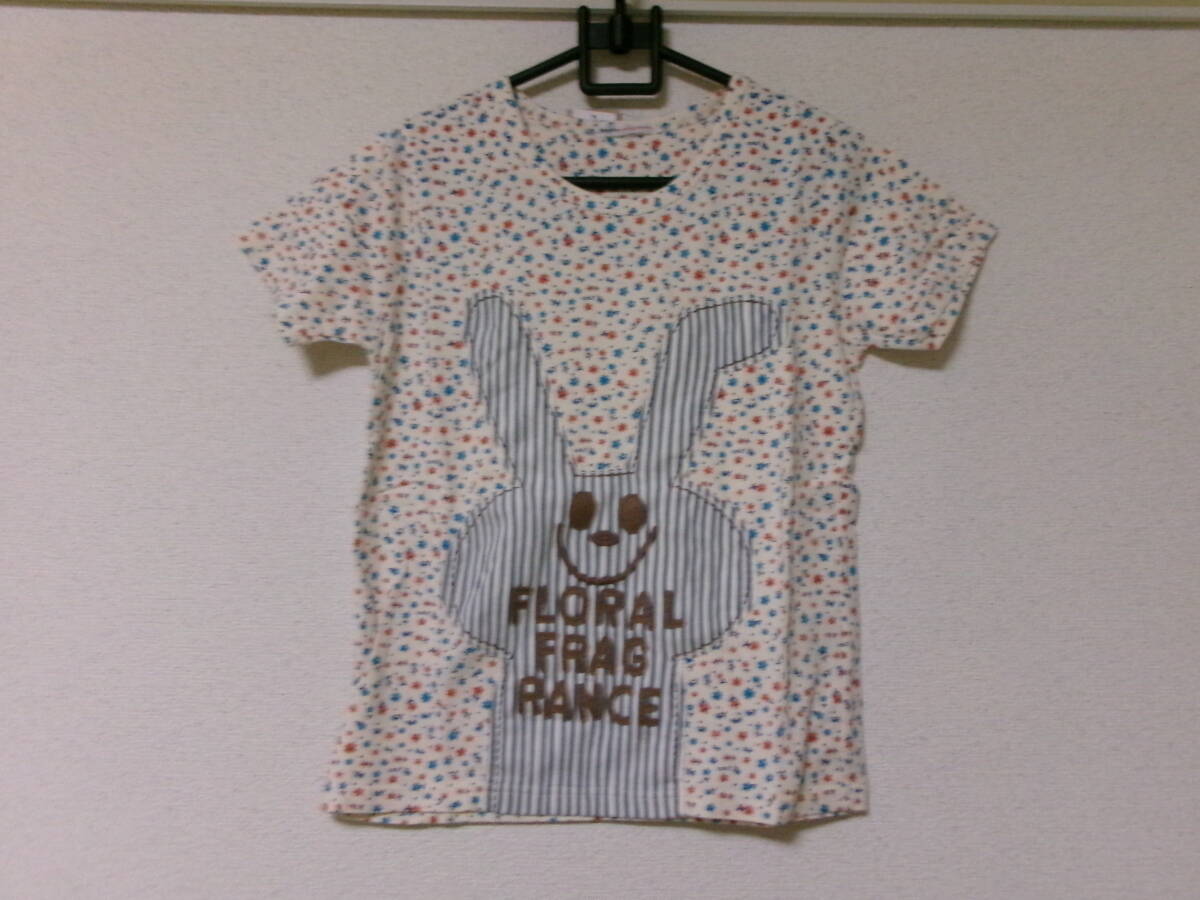> ハートマーケット購入☆roughラフ☆アイボリー×ピンクオレンジ×ブルーの小花柄半袖Tシャツ☆ウサギのでかアップリケ☆タグ付き新品未使用