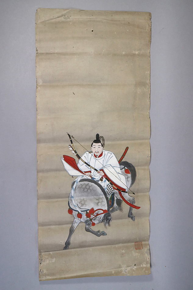 - sg68) 「真作」弓馬上 白狩衣公家人物図「為紊(印) 」江戸時代 捲り・紙本 色絵 彩色 墨書 <日本画