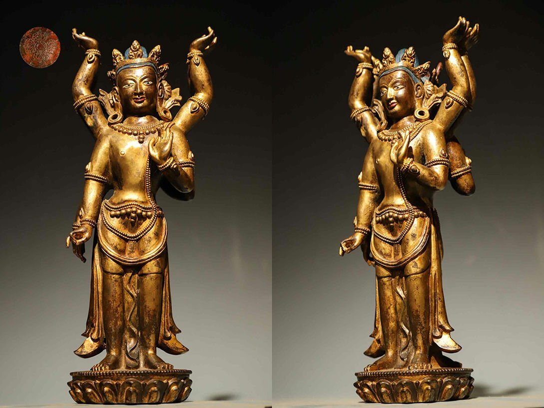 - ▼渡鶴羽▼W2033明時代 銅塗金 双面蓮花手観音造像 細工彫刻★仏教古美術★仏像★細密細工★廃寺旧蔵★廃寺買出品