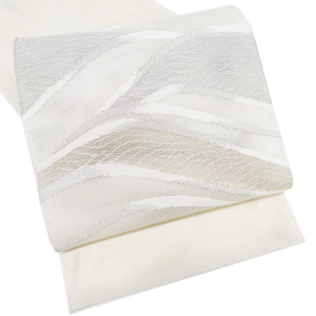 - 夏物 夏帯 袋帯 中古 リサイクル 正絹 紗 フォーマル 仕立て上がり お太鼓柄 波文 箔糸 生成色 金銀 きもの北條 A1210-10