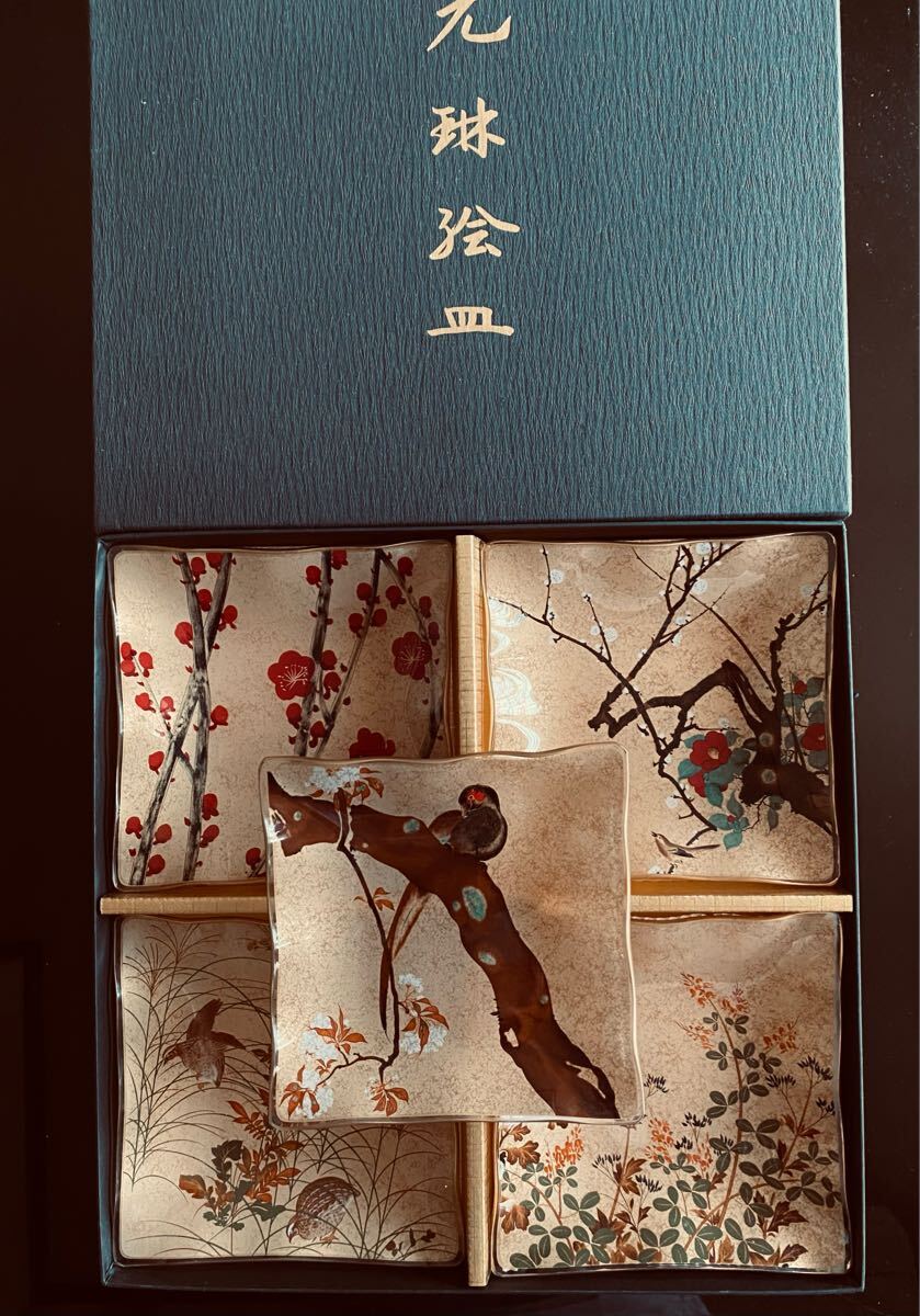 - 新品未使用◆川村硝子 光琳絵皿 絵変わり銘々皿5枚セット 銘々皿五客 高級感 和食器 川村硝子工芸 菓子皿 角皿 絵皿 カワムラガラス