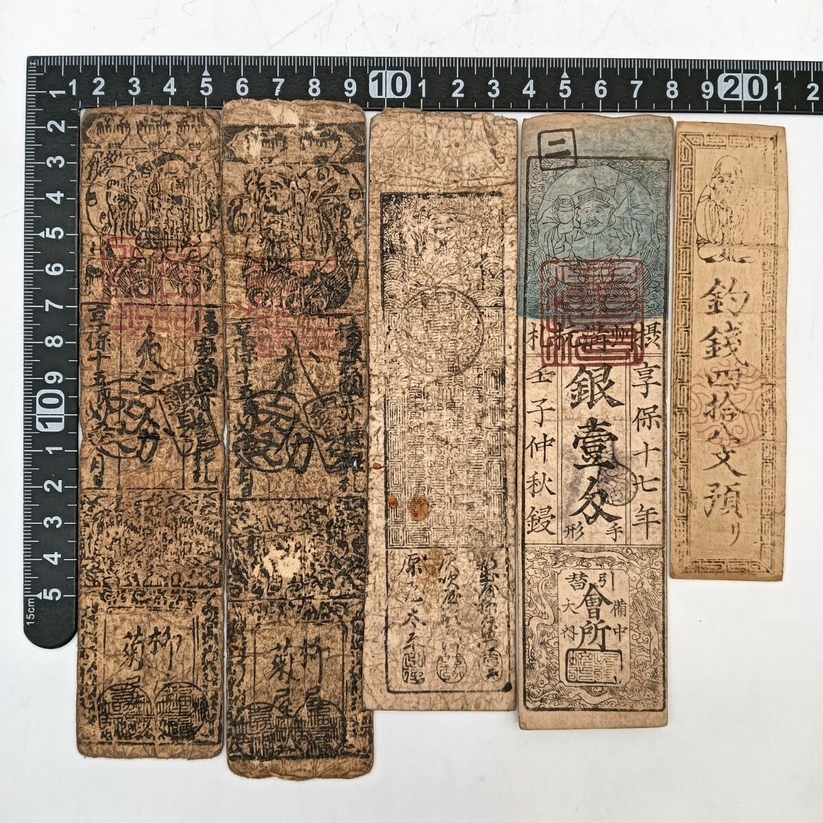 - 【A3461】江戸〜明治時代 古札 藩札 私札 朱印 貨幣 古紙幣 古文書 骨董品 アンティーク 5枚まとめ