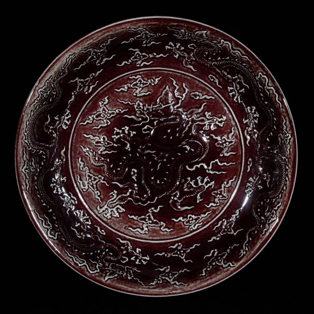 - 『館蔵珍品 明 宣德年製款 古陶瓷品 祭紅釉 窯變 云龍紋 供盤 陶藝』稀少珍蔵品 古賞物 貴重物品 収蔵品 中国古美術 時代物 古董品