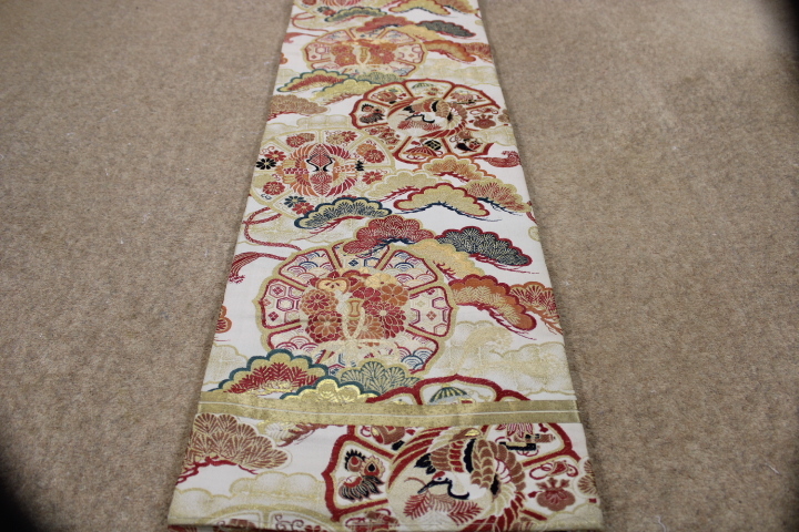 - きもの今昔8622 ビンテージ丸帯 西陣織正絹豪華絢爛 両面全通帯 向い鶴宝尽くし三階松などの縁起物