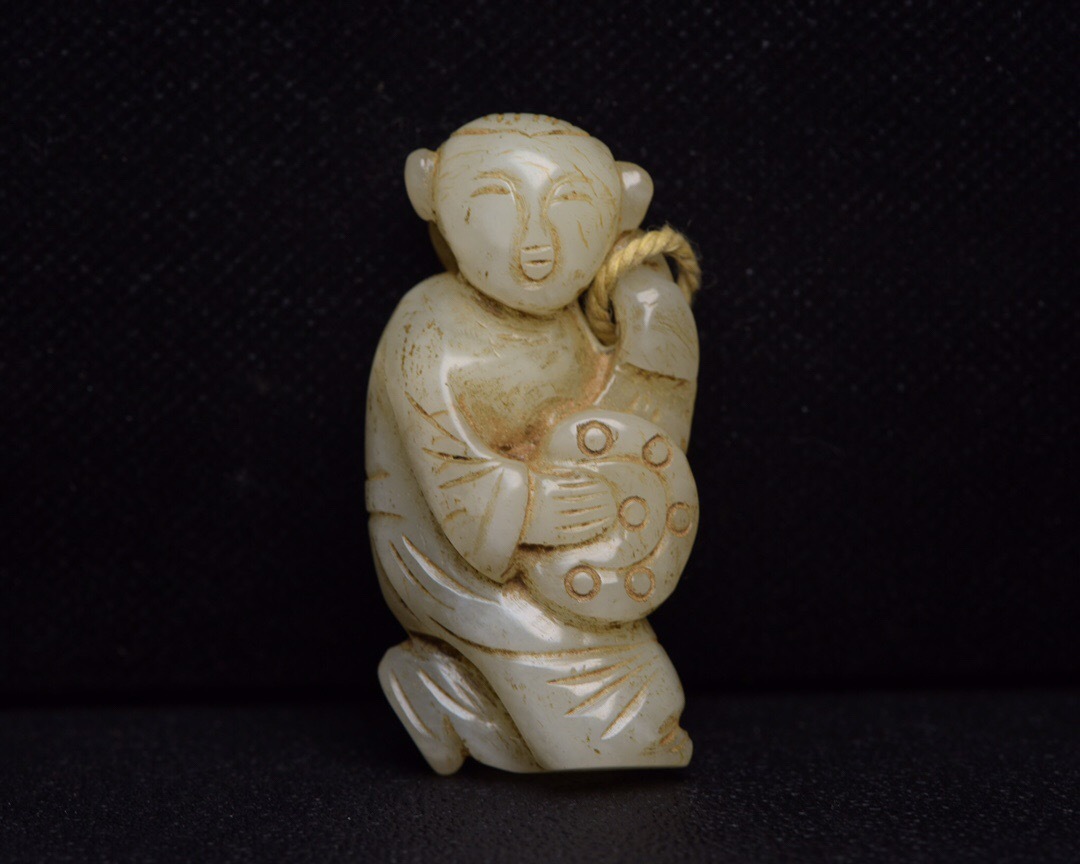 - 『館蔵珍品 和田玉製 細密彫 持蓮童子 置物 賞物』稀少珍蔵品 古賞物 貴重物品 収蔵品 中国古美術 時代物 古董品