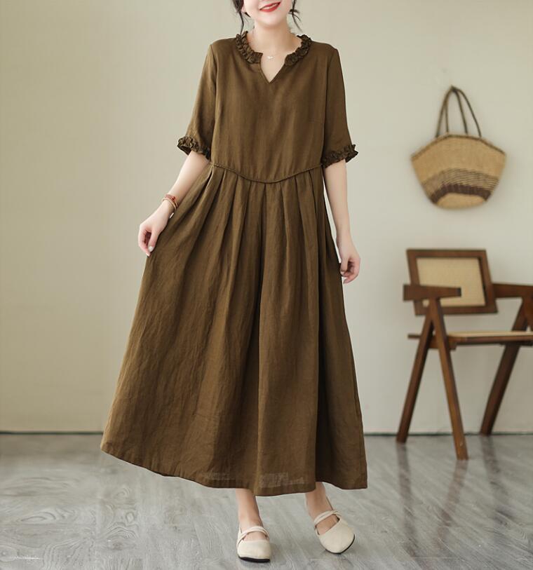 - 新入荷* カジュアル ゆったり 綿麻 ロングワンピース 30代40代50代 素敵な 半袖 大きいサイズ