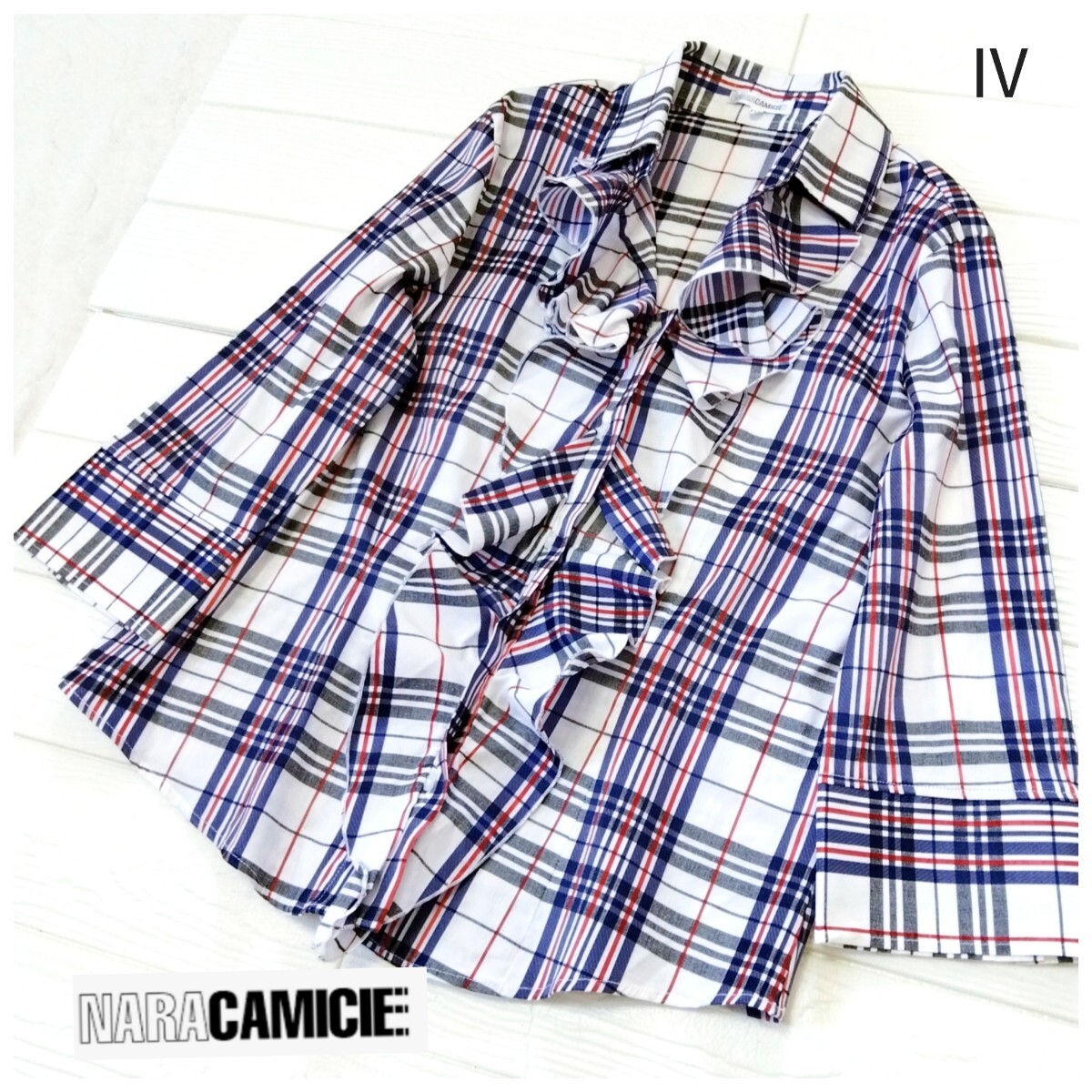 > NARACAMICIE*ナラカミーチェ*大きいサイズⅣ*イタリアンチェック*ブラウス*胸元フリル*ストレッチ生地*15号
