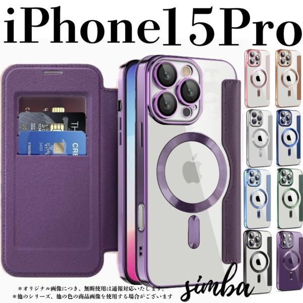 - iPhone 15 Pro ケース 手帳型 カード収納 レンズ保護 レザー MagSafe対応 フリップケース パープルクリア
