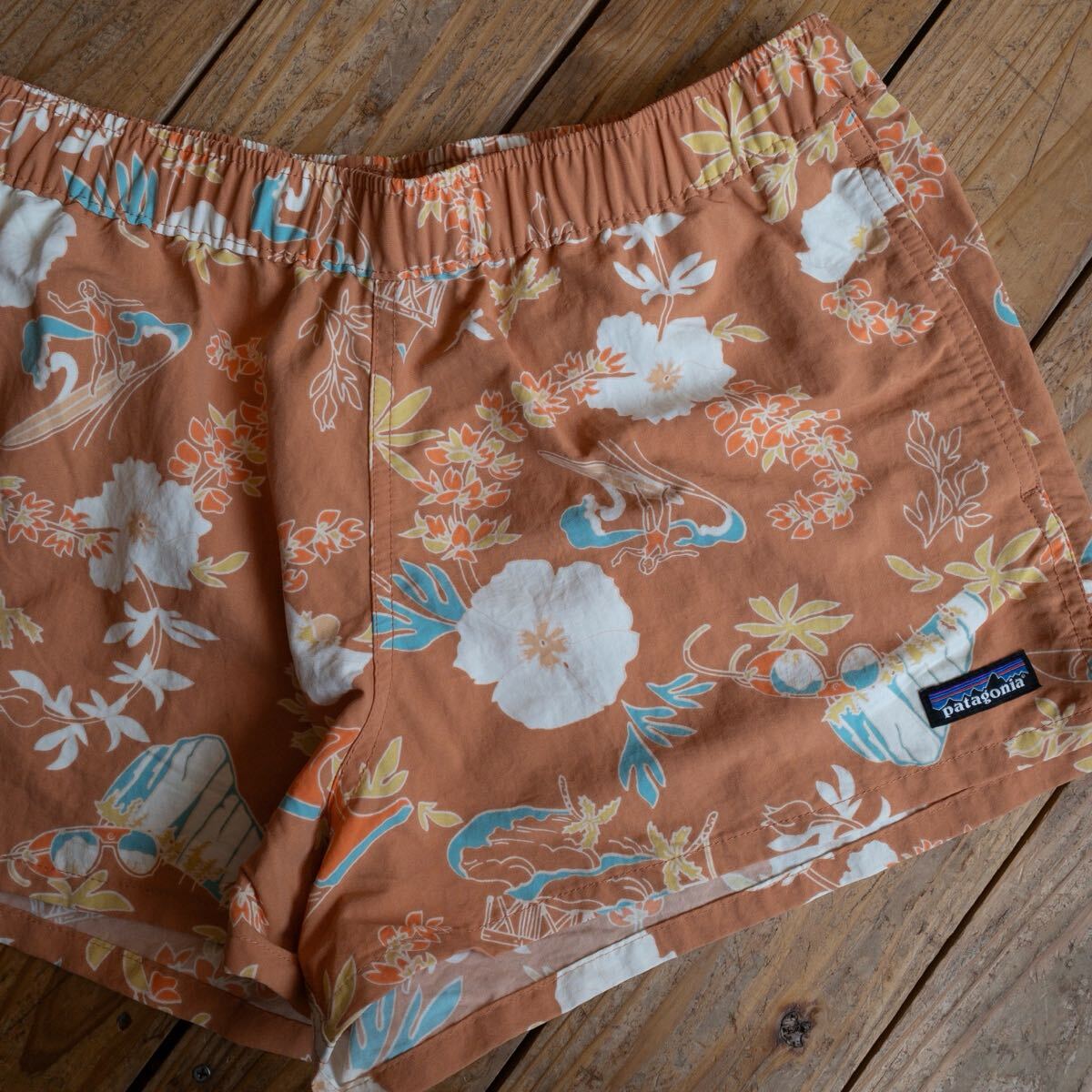 > USA古着 patagonia パタゴニア バギーショーツ レディース Mサイズ 花柄 ボタニカル 膝上 植物 ポップ オレンジ 鳥 バード P1831