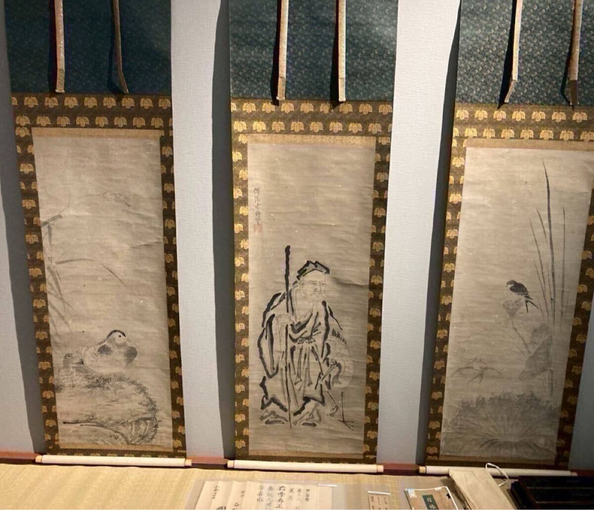 - 『雪舟等楊』中寿老人右蓮ニ燕左芦ニ鴛鴦三幅対 狩野探幽外題 狩野益信折紙 前田家筆頭家老本多家旧蔵入札目録【掛軸 日本画 油彩画 水墨】
