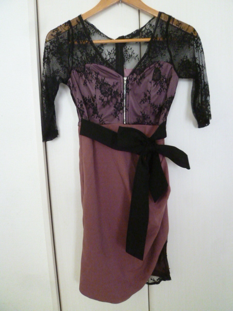 > DAZZY◇くすみピンクパープル系黒レースデザインフォーマルワンピースM/ボディコンキャバ嬢胸パット入りウエストリボン◇OP728