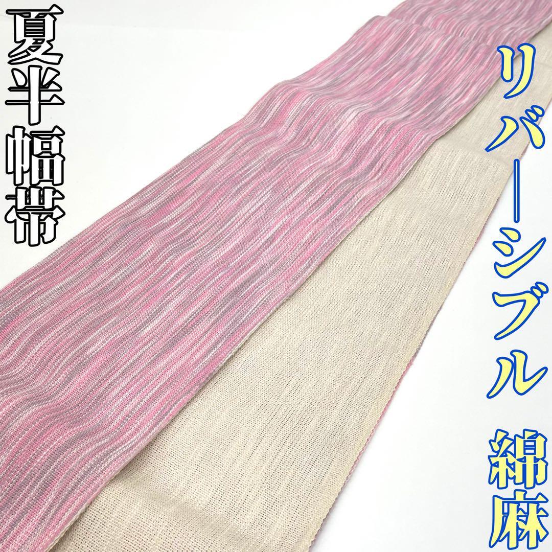 - 【着物と帯 時流】O25756◆半幅帯◆リバーシブル 綿麻 夏帯 ピンク 美品