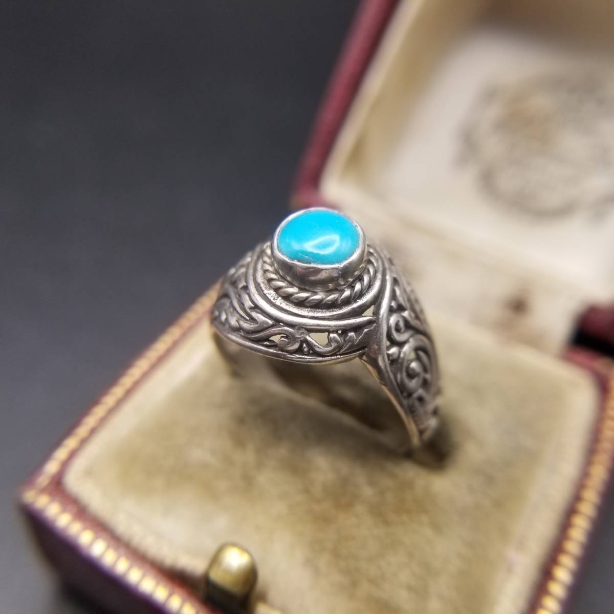 - ターコイズ 植物 デザイン オープンワーク 925 シルバー ヴィンテージ リング 2g 銀 指輪 サウスウェスタンジュエリー 透かし USA 9Y-V