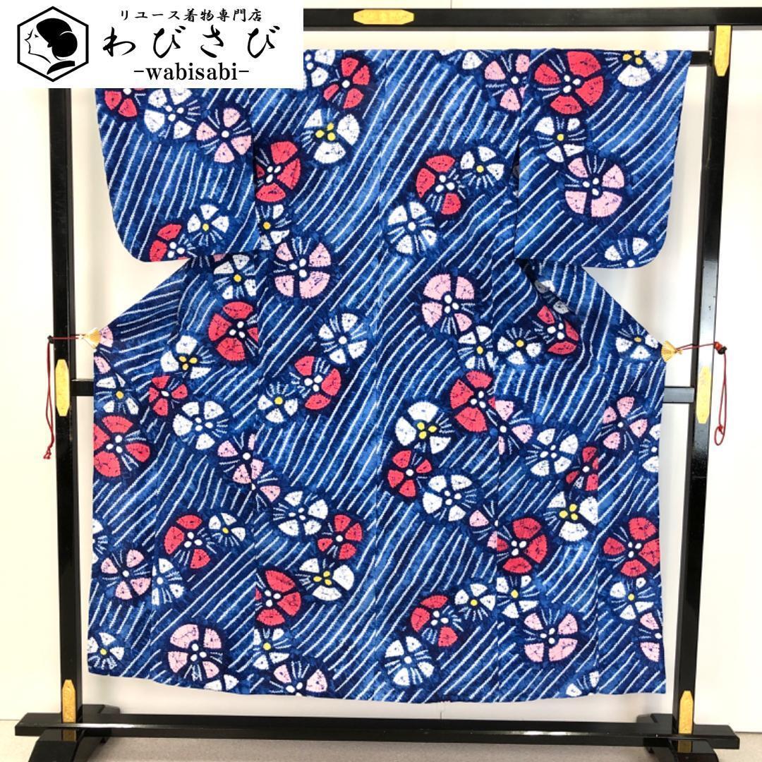 > 夏着物 浴衣 有松鳴海本絞り 斜め曲線模様に花柄 碧瑠璃色 K-5017 着物 きもの kimono 和服 和装 中古 リサイクル着物 【送料無料】