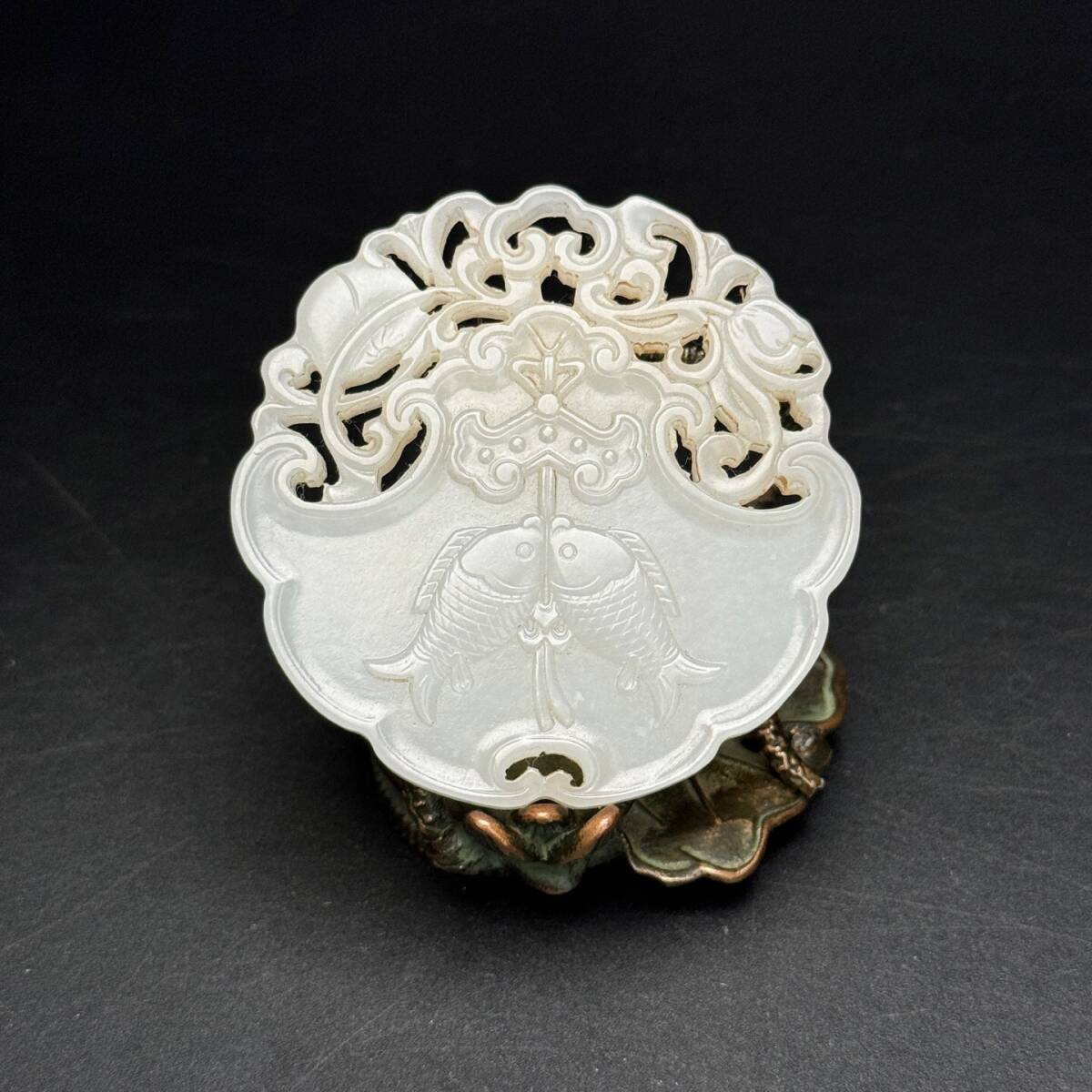 - 蔵友旧蔵出 和田玉製 細密彫 透空彫 雙魚紋 玉珮 希少珍品 貴重品 置物 古賞物 中国古玩 中国古美術品