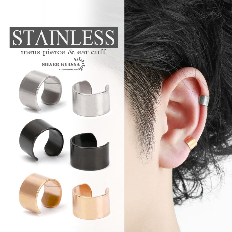 - (シルバー) 両耳用2点セット シンプルイヤーカフ ステンレス シルバー ブラック 小ぶり ゴールド 男性 挟むだけ 耳の穴不要