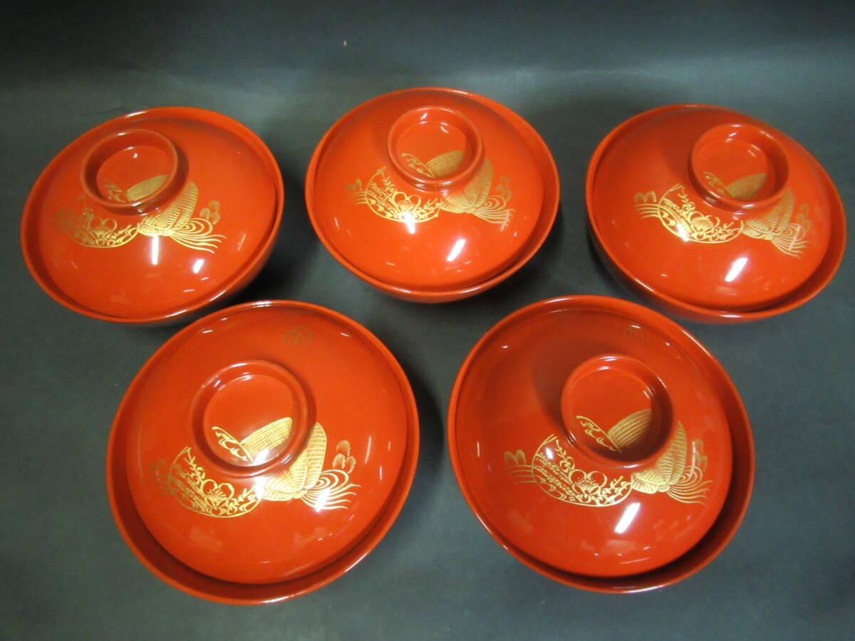- 【広吉堂】輪島塗 吸物椀 漆器 木製 時代物 蒔絵 貝絵 美品 5客(K76G)