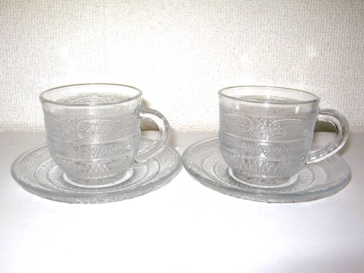 - ヴィンテージ【ガラス製 カップ&ソーサー 2組】昭和レトロ アンティーク ノスタルジー ティーカップ コーヒーカップ ガラス細工 硝子細工