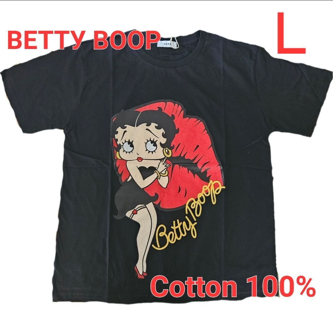 > 【新品】Tシャツ Lサイズ ベティちゃん BETTY BOOP 黒ブラック 古着風ヴィンテージ 綿コットン100 可愛い大きめ大判シャツ 赤キスマーク唇