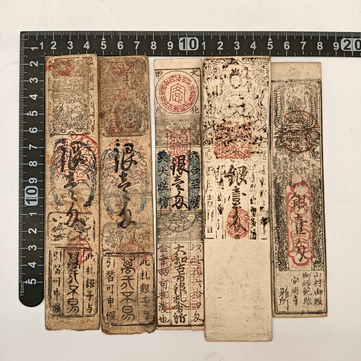 - 【A3517】江戸〜明治時代 古札 藩札 私札 朱印 貨幣 古紙幣 古文書 骨董品 アンティーク 5枚まとめ