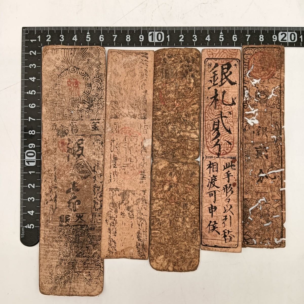 - 【A3555】江戸〜明治時代 古札 藩札 私札 朱印 貨幣 古紙幣 古文書 骨董品 アンティーク 5枚まとめ