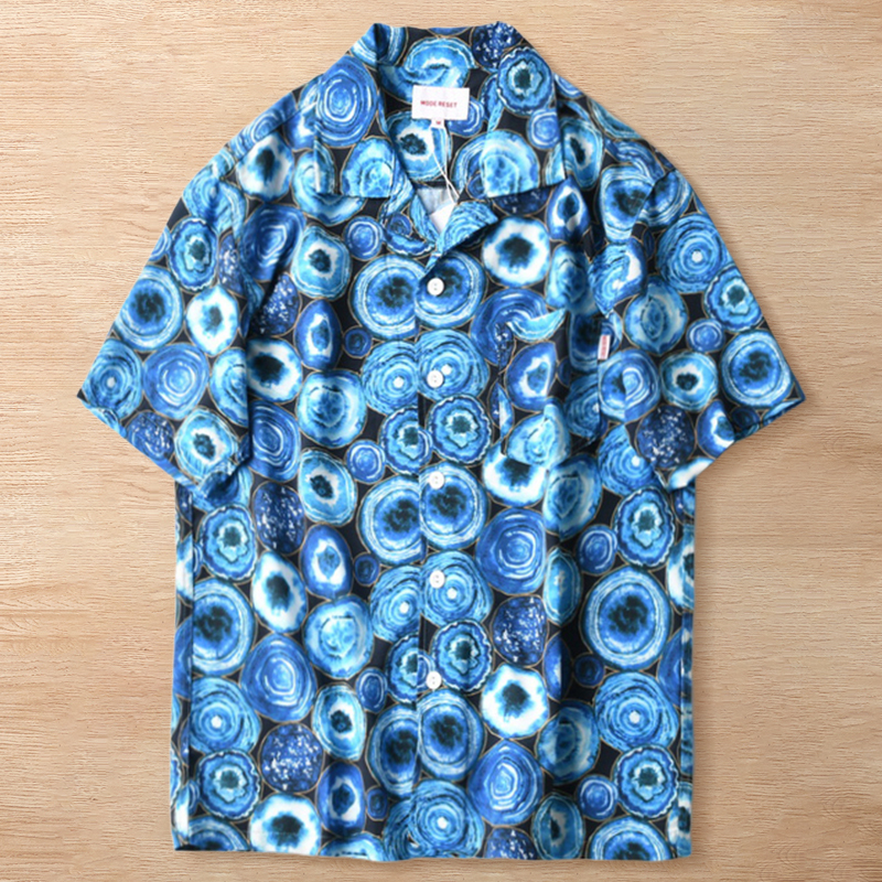 - T1847-M/青 新品 接触冷感 速乾 アロハシャツ 半袖 サマー オープンカラー メンズ レトロ柄 総柄 薄手 防シワ 開襟 春夏 盛夏 ゆったり