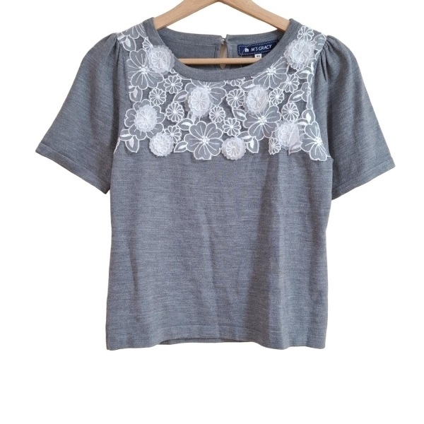 - エムズグレイシー M'S GRACY 半袖セーター/ニット サイズ40 M - グレー×白 レディース クルーネック/レース/フラワー(花)/ラインストーン