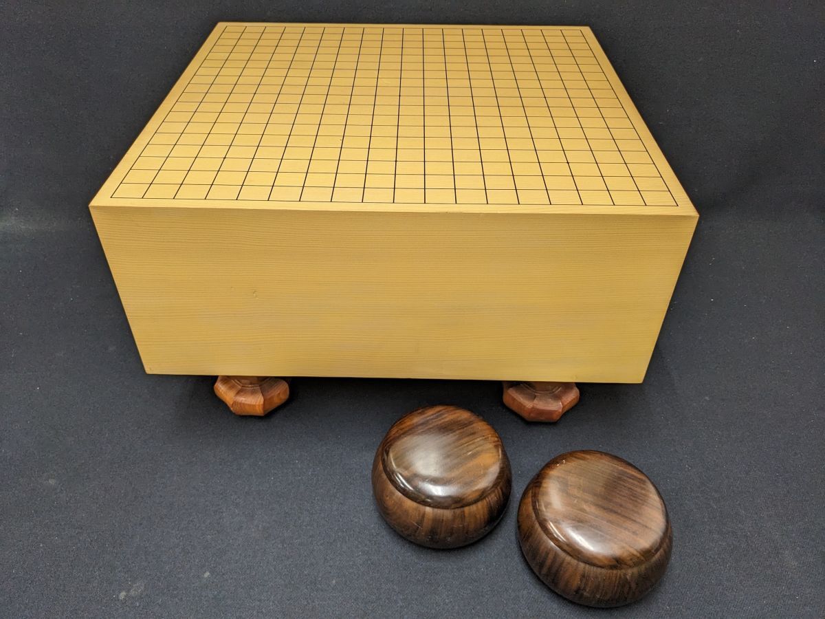 - S591 囲碁道具 新榧脚付碁盤 柾目 厚さ18cm ヘソあり 碁石 黒:那智黒181個 白:プラスチック150個 蛤30個 重量約16kg/140