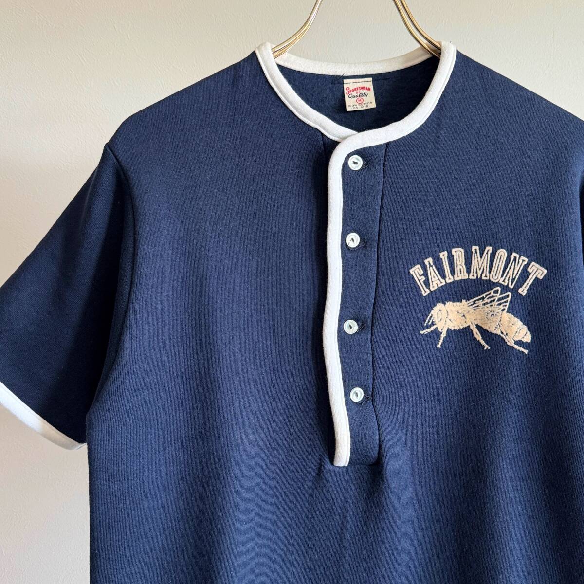 - 希少《 Dead Stock / FIRMONT 》50s 60s デッド【 SPORTSWEAR ビンテージ カレッジ 蜂 ヘンリー フロッキー 半袖スウェット M コットン 】