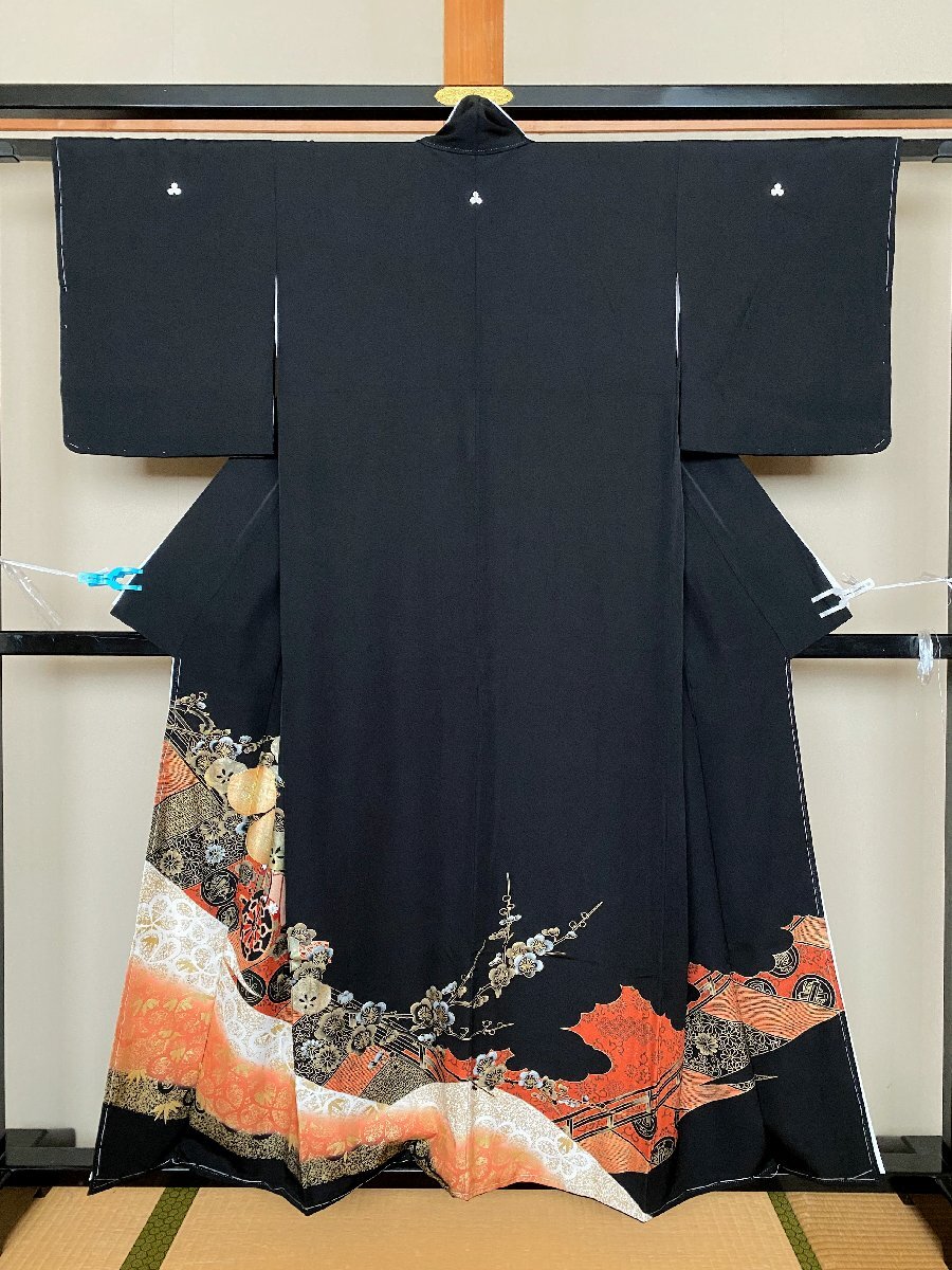 > 247B/アンティーク★女性着物【着用可】黒留袖 しつけ付★金、銀、赤、白 御所車 橘、梅など 正絹??豪華 レトロ 大正モダン お洒落 リメ