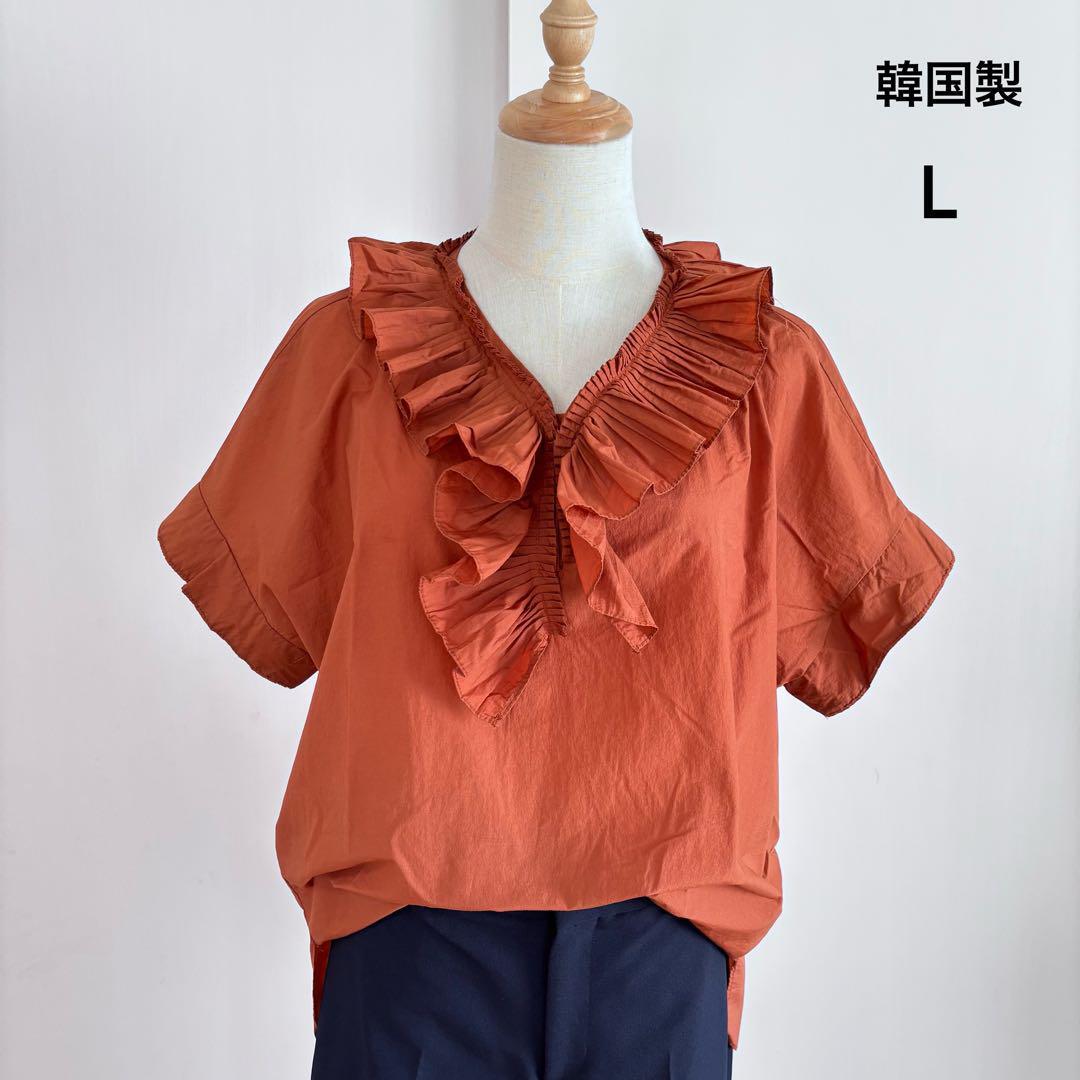 - 韓流ファッション 韓国製 レディース ブラウン フリル 半袖シャツ ブラウス ゆったりめ L