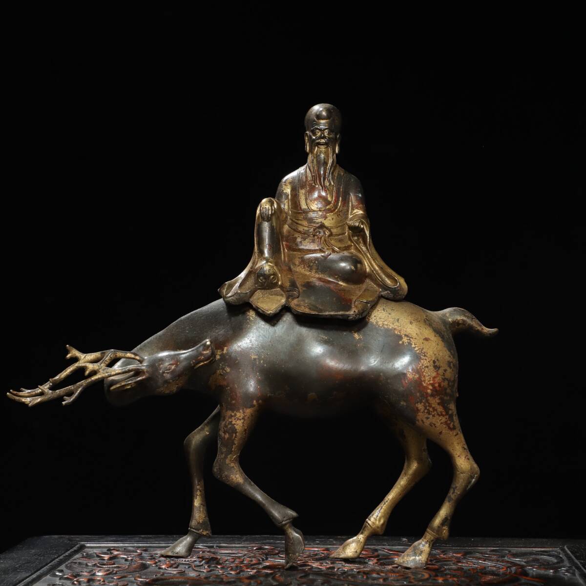 - 蔵友旧蔵出 銅製 泥金 騎鹿壽星像 希少珍品 貴重品 置物 古賞物 密宗密教 供養品 仏教美術品