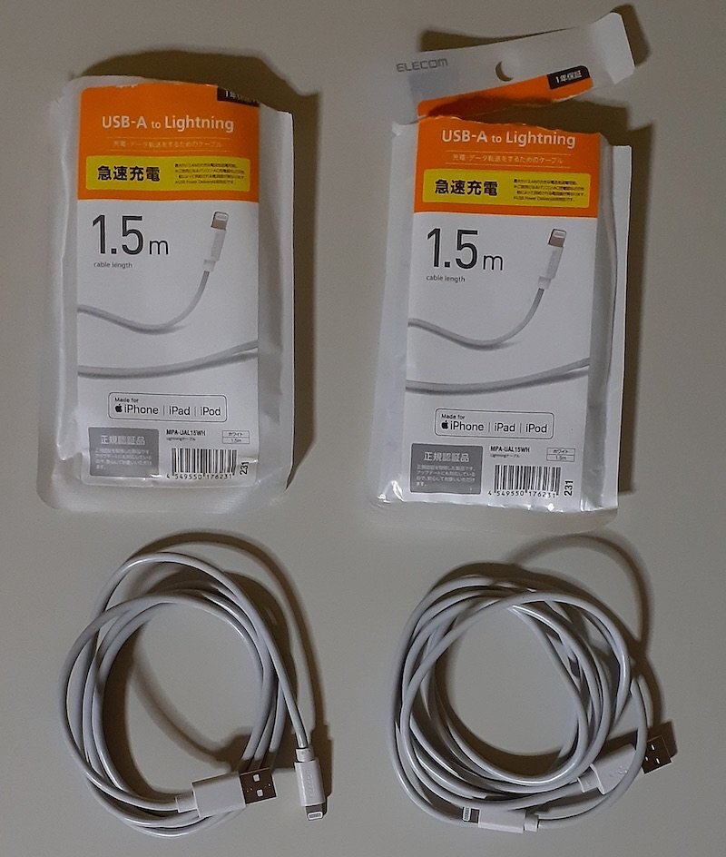 - 6034 なかなかきれい MPA-UAL15WH ELECOM USB-A to Lightningケーブル 1.5m 2本まとめて 急速充電