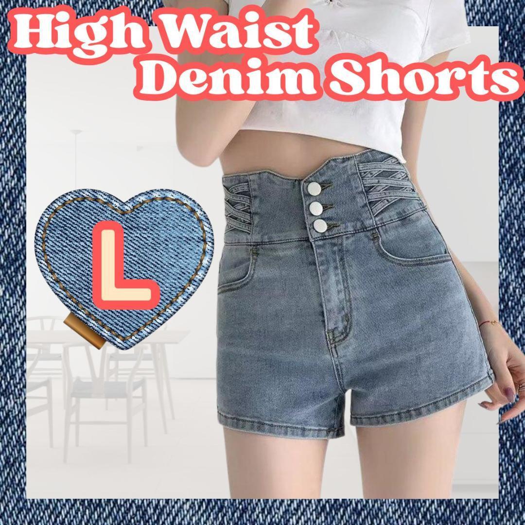 - ハイウエスト デニム ショートパンツ L ホットパンツ ブルー ウエストクロス