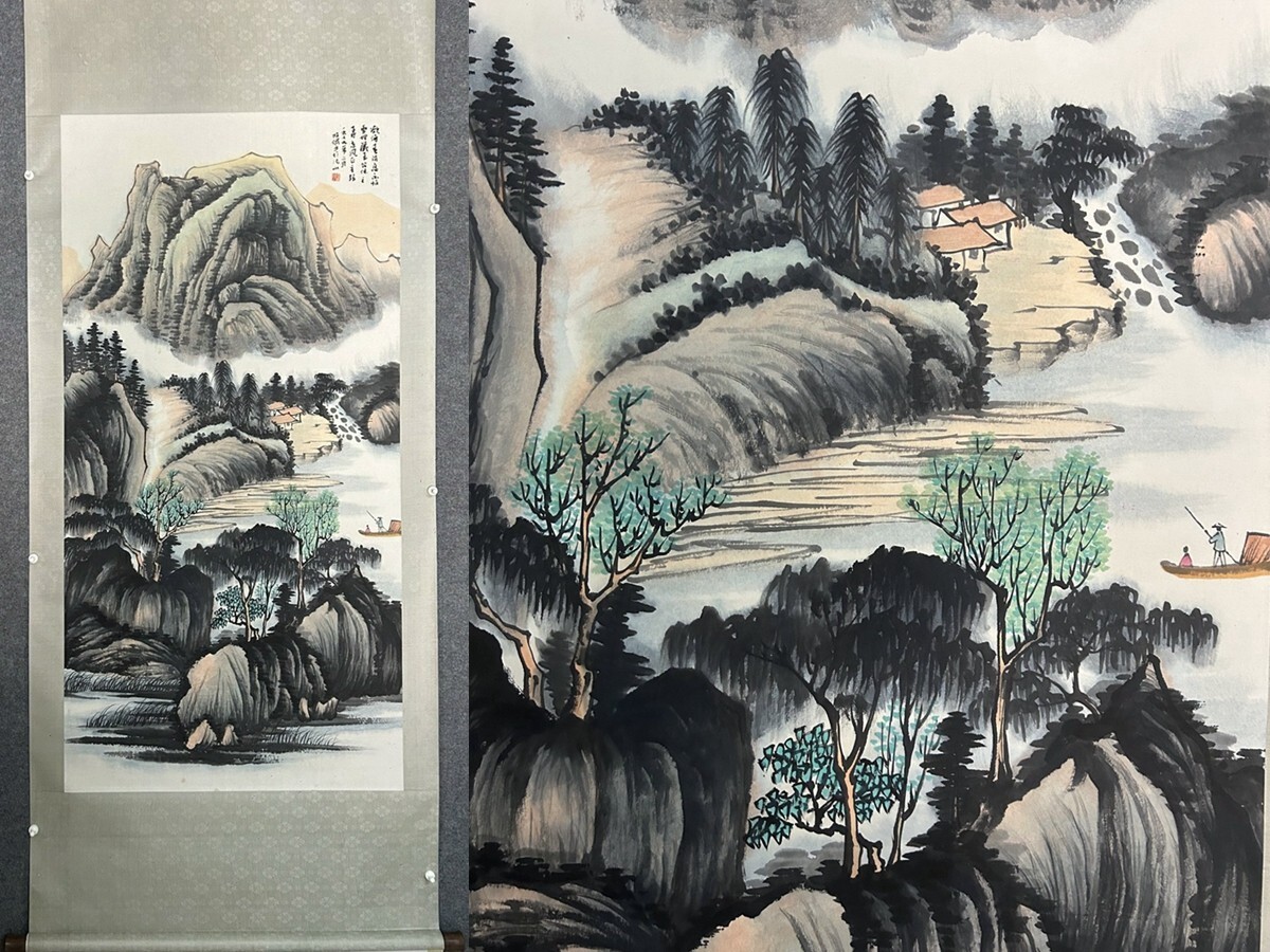 - 中国書画「陸嚴少 山水人家図」肉筆金紙本 掛け軸 墨寶妙品 書画立軸 巻き物 古美術 旧蔵出