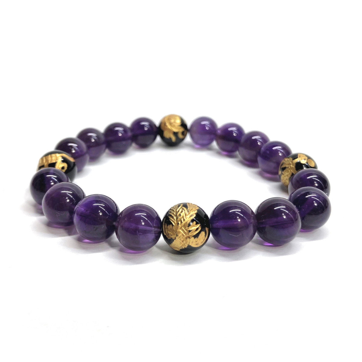 - 10mm 四神獣金彫オニキス×アメジスト パワーストーン ブレスレット天然石 運気上昇 開運 金運 恋愛運 お守り 青龍 白虎 玄武 朱雀