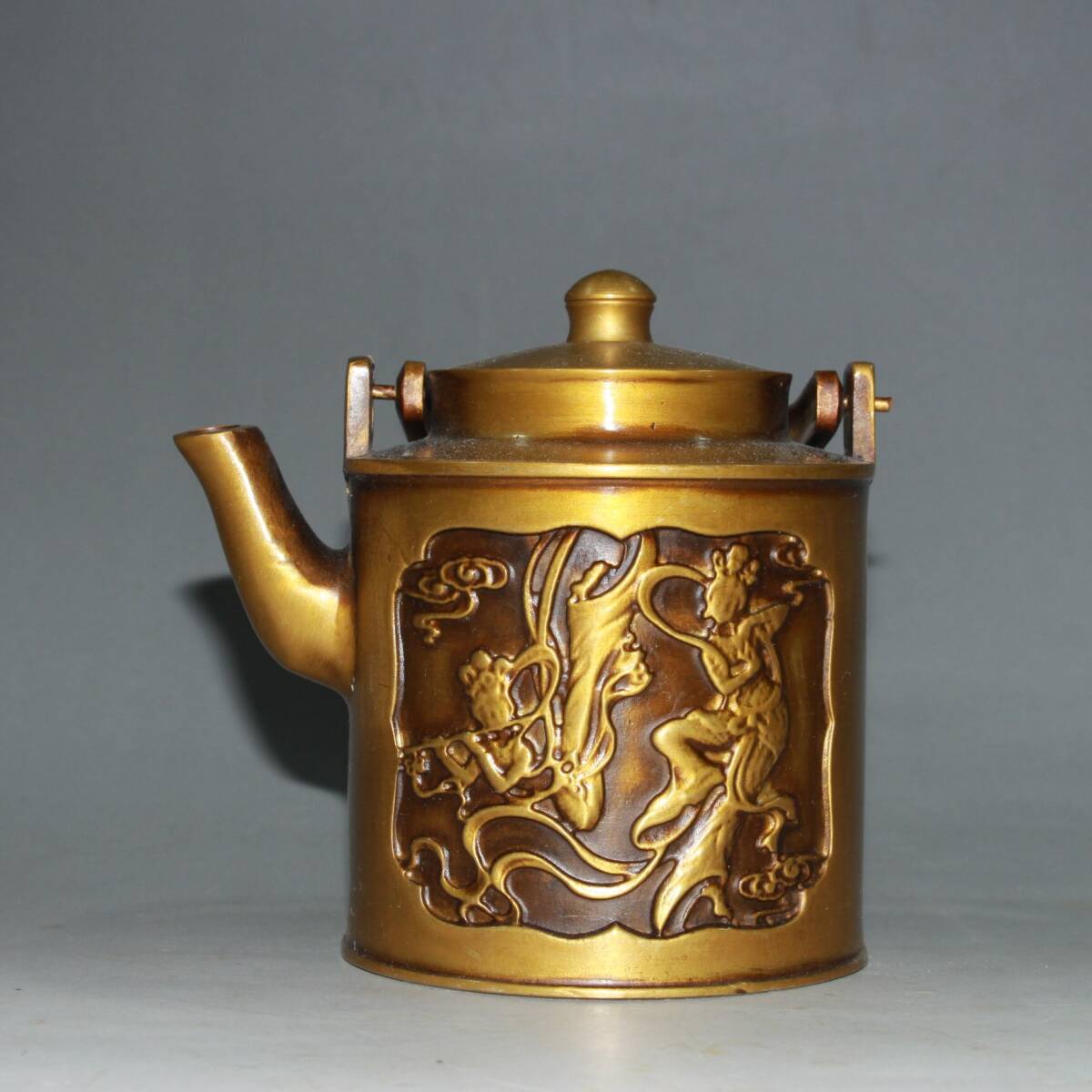 - 蔵友旧蔵出 銅製 金鍍 飛天仙女紋 提梁酒壺 希少珍品 貴重品 置物 古賞物 中国古玩 中国古美術品