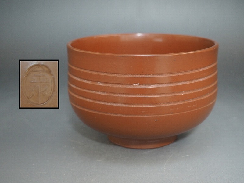 > A4180 佐渡無名異焼 丸山金水 作 朱泥茶碗 ☆ 茶道具 抹茶器 抹茶道具 茶懐石 茶事 茶碗 抹茶碗 陶器 作家物 在銘 陶印 美品 良品 無傷