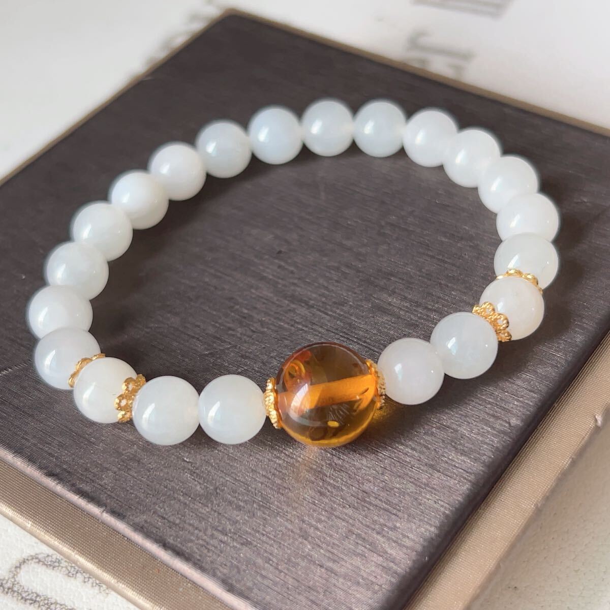 - ◇アンバー琥珀(花珀)+和田玉◇ブレスレット◇◇パワーストーン◇天然石◇巾着袋付き◇プレゼントにも038B7211