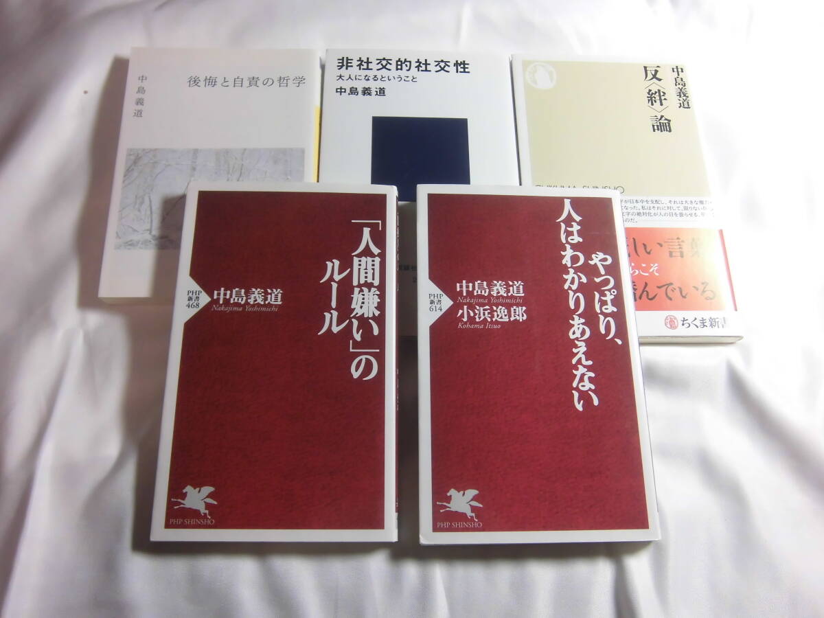 「後悔と自責の哲学」中島 義道 (著)2009年初版定価670円+税。と「反絆論」中島 義道(著) 1998年初版定価660円+税と「怒る技術」中島 義道 (著)2006年初版定価438円+税。と「やっぱり、人はわかりあえない」中島 義道 (著) 2009年初版定価720円+税。と「非社交的社交性 大人になるということ」中島 義道 (著) 2013年初版定価740円+税。と「人間嫌いのルール 」中島 義道 (著) 2007年初版2007年2刷定価700円+税の計5冊セット。