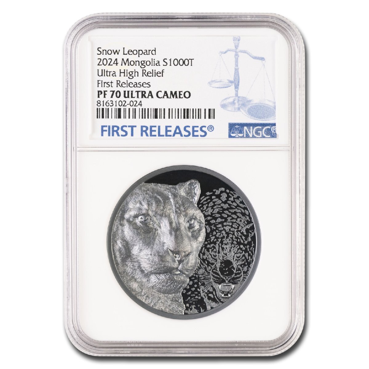 > [保証書・スラブ付き] 2024年 (新品) モンゴル「ユキヒョウ」純銀 2オンス NGC PF70 ウルトラカメオ プルーフ 銀貨 (ファーストリリース)