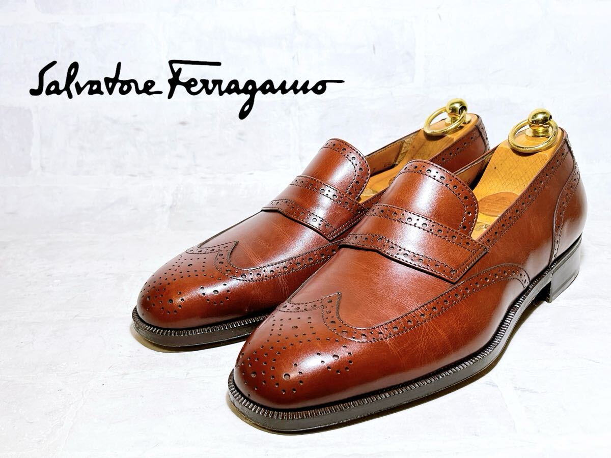 > 1回着【極美品】サルヴァトーレフェラガモ 高級 ウィングチップ ローファー ビジネスシューズ 茶 本革 レザー US7EE(約25cm)イタリア製